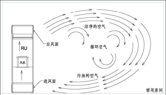 RU 自循环过滤系统是一种独立完整的空气净化设备。设计放置于配有电子控制系统的房间内部,通过自带风机的吸、吹动力对室内的空气进行循环净化,以保护房间内电子设备不被腐蚀。