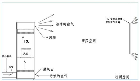 2.安装于密闭房间内,通过对房间内的循环空气进行净化,并对室外引入的新风进行净化为整个空间提供正压,并以次循环下去,保持室内正压,防止室外污浊空气的进入。